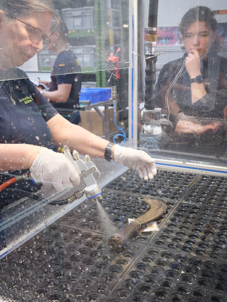 An der Nassreinigungsstation machten sich die Teilnehmenden zunächst mit den verschiedenen Funktionen des Moduls – Pendelbrause, Airbrush, Reinigungsaufsatz– vertraut, bevor sie den Umgang mit den unterschiedlichen Materialien ausprobierten. Ein besonderer Schwerpunkt lag auf der korrekten Vorgehensweise beim Einwickeln von Büchern und Archivmaterialien.