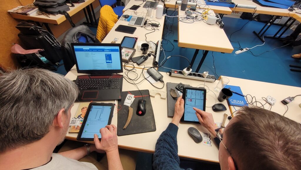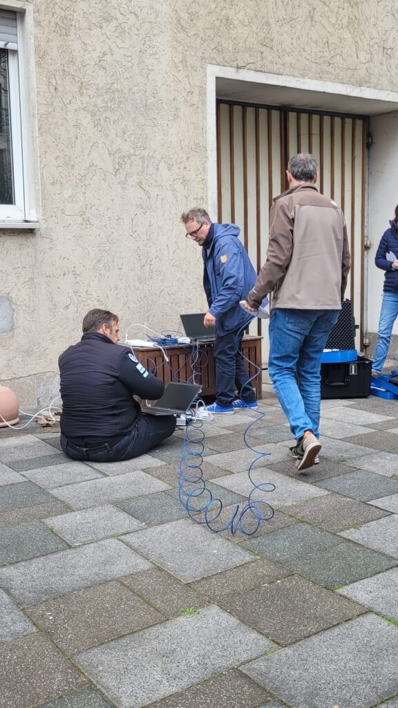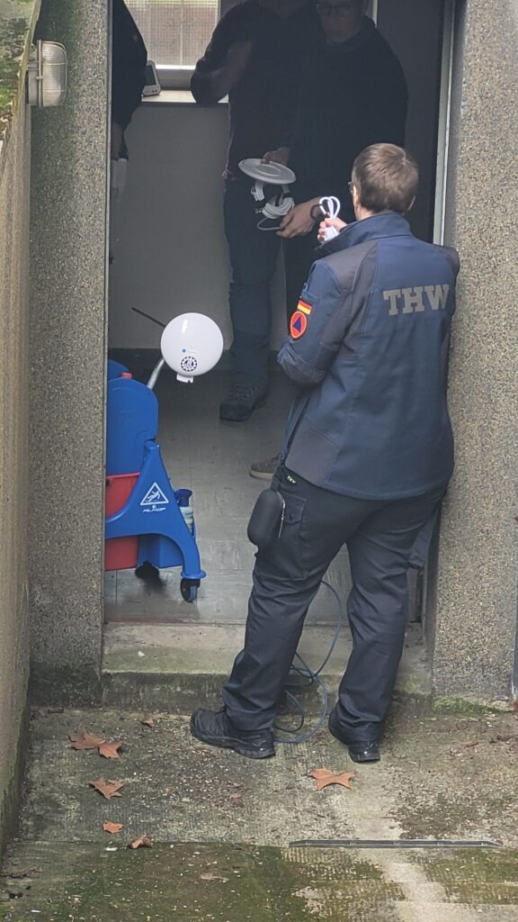 In Zusammenarbeit mit den THW-Einsatzkräften aus dem Bereich ICT konnte das neue „Kit E“ getestet werden. Dieses enthält alle Komponenten, um in einem Einsatz ein eigenes flächendeckendes Netzwerk aufzubauen. Innerhalb dieses Netzwerks können beispielsweise mit mobilen Geräten Daten erfasst werden. Dafür wurden im Keller und im Garten der RGK Access-Points verteilt und über Kabel oder Funk verbunden. So konnten die Teilnehmenden auf den Einsatztablets der CHRU im gesamten Netzwerkbereich mobile und immobile Kulturgüter dokumentieren. Die an unterschiedlichen Stellen erzeugten Datensätze wurden live von den mobilen Geräten in die gemeinsame Datenbank eingespielt.