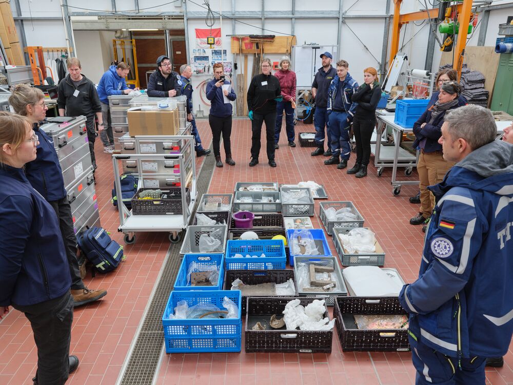 Auch logistische Probleme, die während des Einsatzes auftreten können, wurden in der Fachausbildung behandelt. Nach der Ankunft im Einsatzland besteht der erste Schritt darin, eine Palettenliste der zahlreichen Alukistenstapel zu erstellen; anschließend werden die Transportkisten sinnvoll verteilt und gelagert. Zudem übte das Team die Ausstiegsstrategie für den Umgang mit dem Nassreinigungsmodul. Reinigen, Trocknen, Verpacken – das alles braucht Zeit.