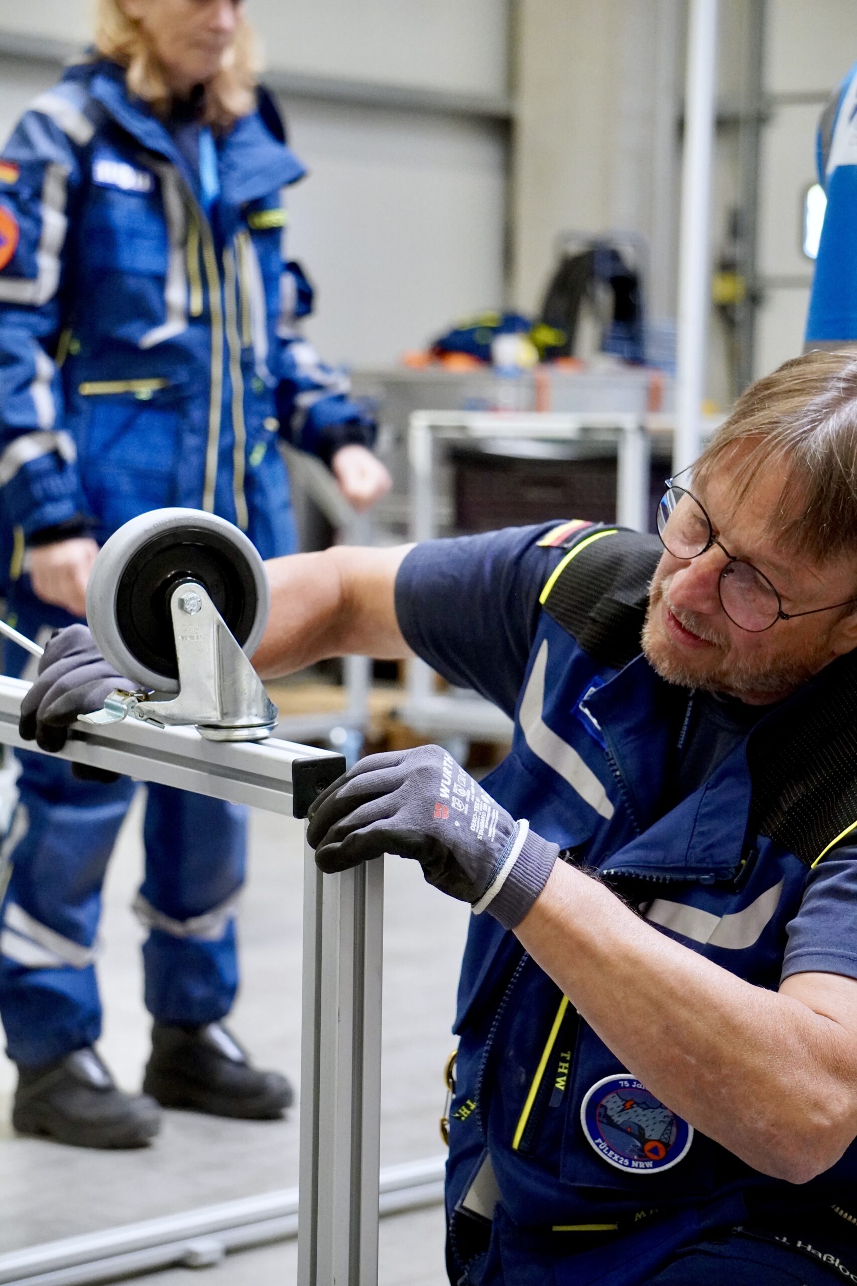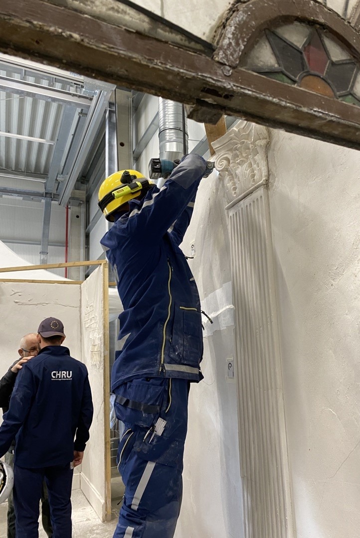 Während der Ausbildung lernten die Teammitglieder das Equipment und die Workflows der Auslandseinsatzeinheit CHRU kennen. Für das Zirkeltraining wurden zwei Hallen des THW-Logistikzentrums mit der Ausstattung eingerichtet. Zum einen ein mobiles Labor für die Notkonservierung und Erstversorgung von beweglichen Kulturgütern. Die einzelnen Module des Labors werden für die fotografische Dokumentation, Trockenreinigung, Nassreinigung und Verpackung von den Expert:innen genutzt, um die Arbeitsabläufe für den Schutz von Kulturgütern aller Art zu erlernen. Im Ernstfall – etwa bei Erdbeben, Überschwemmungen oder Bränden – müssen Mitglieder der CHRU in der Lage sein, Objekte aller Art und aus verschiedensten Materialien zu erfassen, zu sichern und zu stabilisieren.